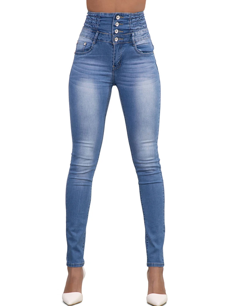 Slide Light Blue High Waist Stretch Jeans Women With Button Skiny Booty Lift Pencil Pants Washed Denim Trousers Summer Cothing
